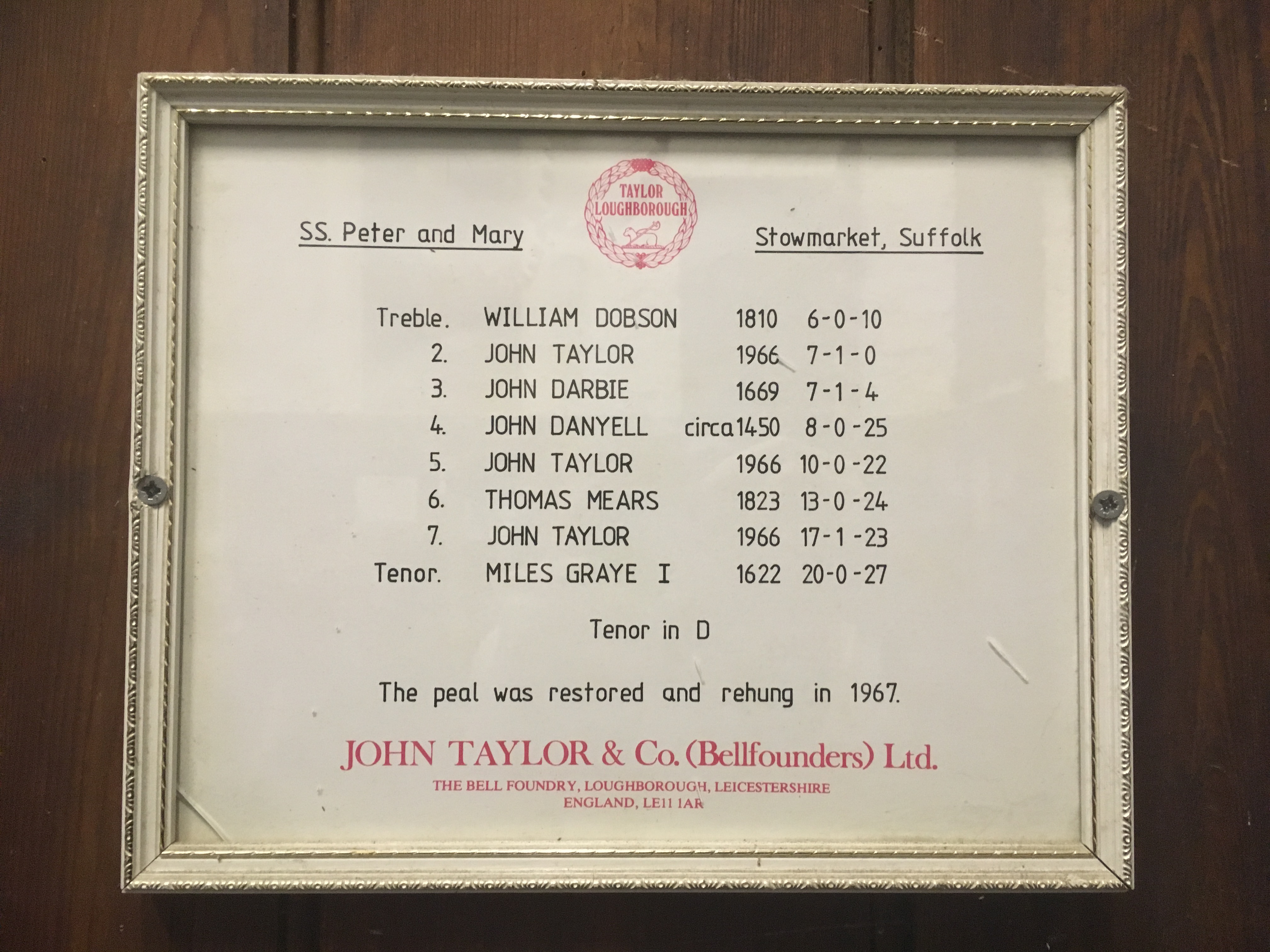 Bell ringing in Stowmarket has a fine pedigree, with over 250 peals known to have been rung on the bells (more than 5000 changes, or about 3 hours of ringing). The longest peal on the bells was rung in 1997 and lasted for 5 hours and 32 minutes. Sadly such a feat could not be repeated today owing to the state of the bells.